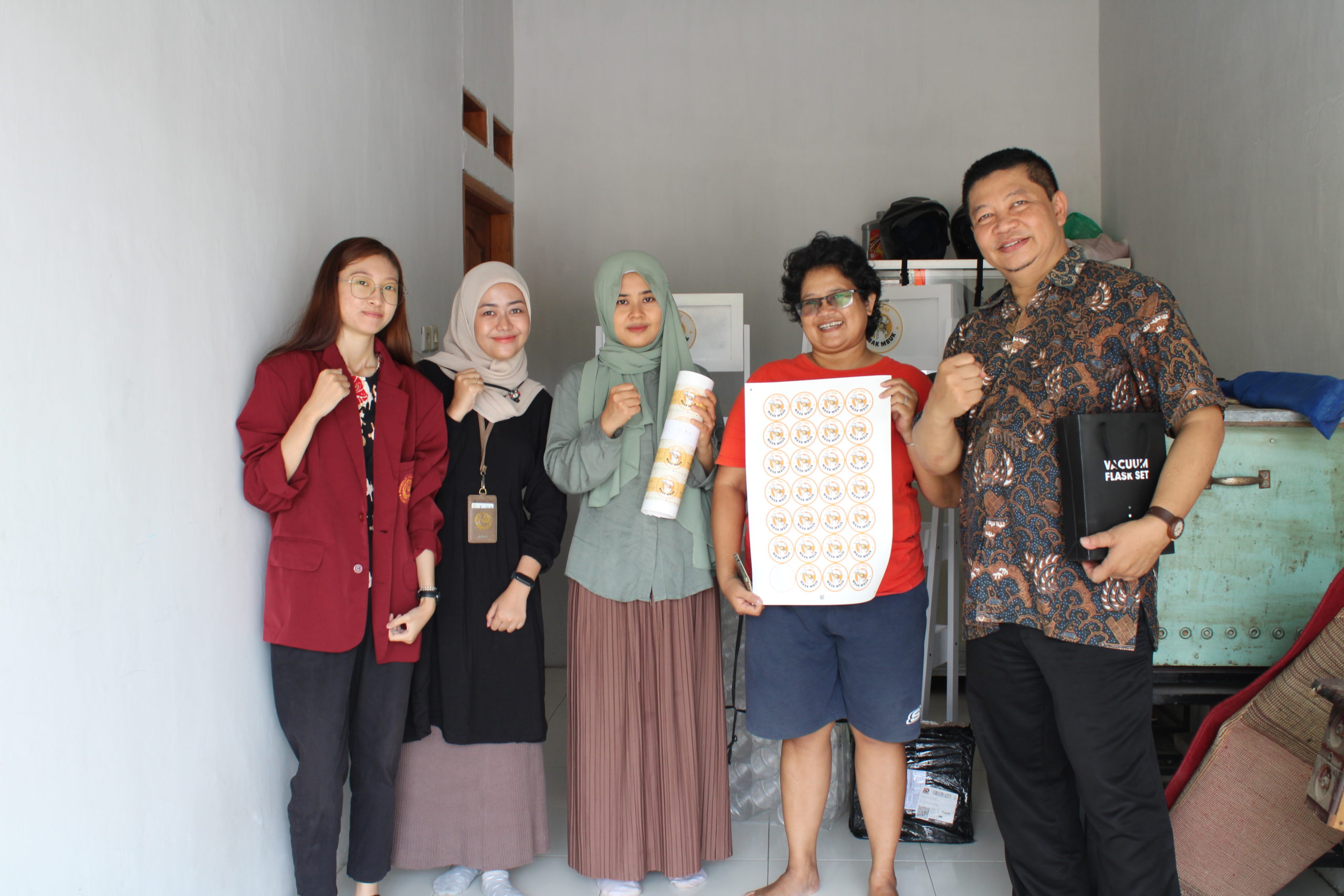 Serah terima alat bantu produksi kepada mitra UMKM Berbahan Mocaf di Delanggu Klaten, berupa rak display, media promosi cetak, dan kemasan yang disesuaikan dengan karakter produk